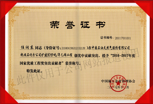 2017年11月10日,根據(jù)中施企協(xié)字【2017】66號(hào)文件——《關(guān)于表彰2016-2017年度國家優(yōu)質(zhì)工程獎(jiǎng)的決定》公告,我單位所監(jiān)理的“中國石油天然氣股份有限公司撫順石化分公司擴(kuò)建80萬噸/年乙烯工程”榮獲2016-2017年度國家優(yōu)質(zhì)工程獎(jiǎng),該項(xiàng)目總監(jiān)“任潤東”還獲得了“2016-2017年度第二批國家優(yōu)質(zhì)工程獎(jiǎng)突出貢獻(xiàn)者”的榮譽(yù)稱號(hào)。